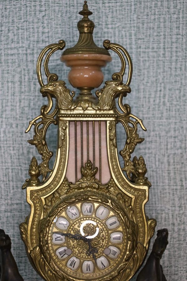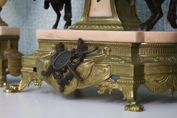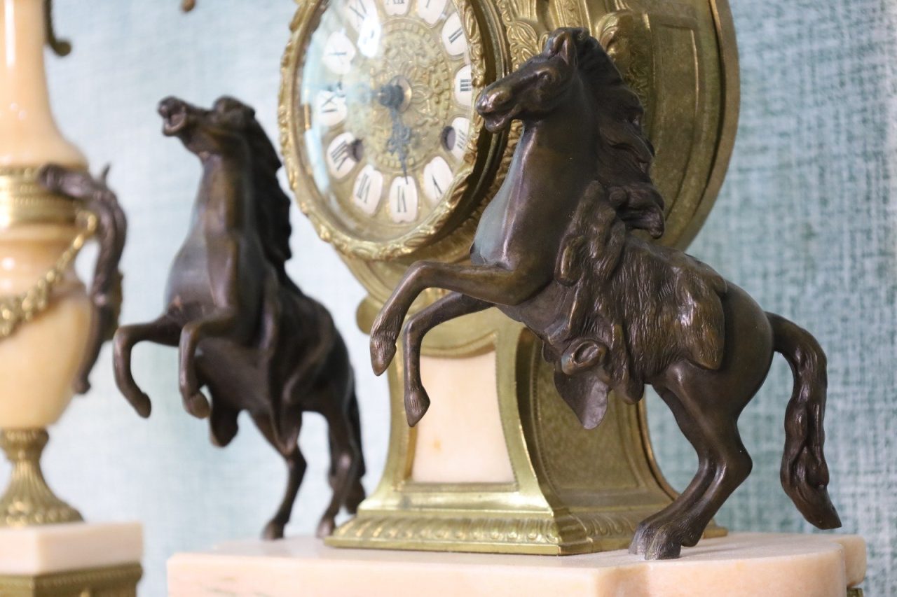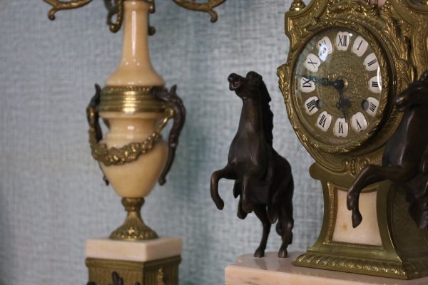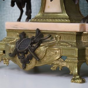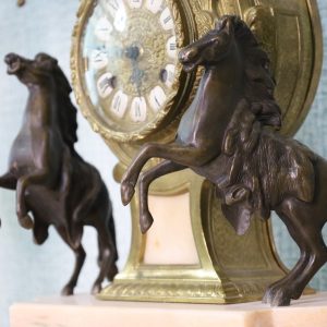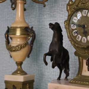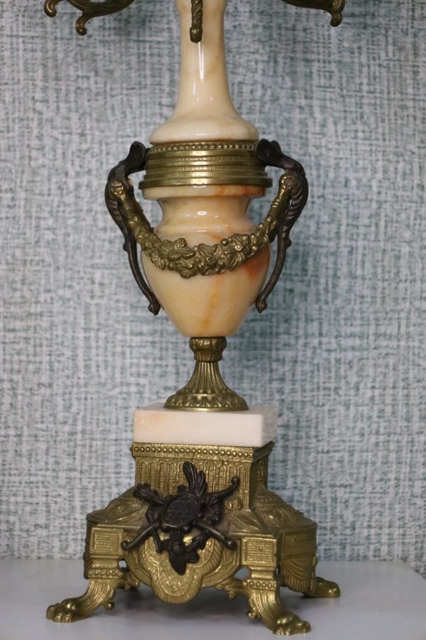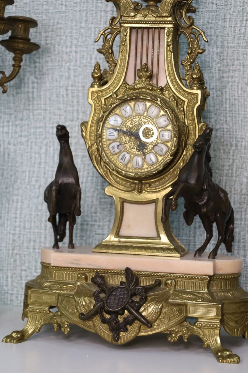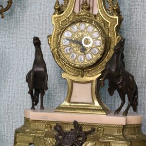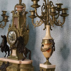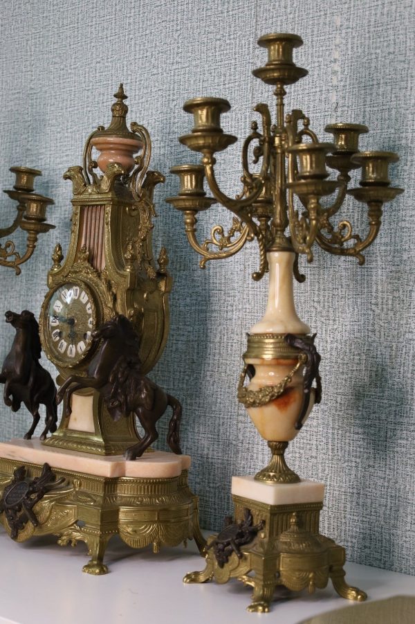 Crafted with meticulous detail, the mantle clock stands as a centerpiece, reflecting the elegance of a bygone era. The Empire style, characterized by its regal motifs and classical influences, is brought to life by Brevettato’s masterful craftsmanship. The candelabras, matching in splendor, flank the clock with symmetry and grace.